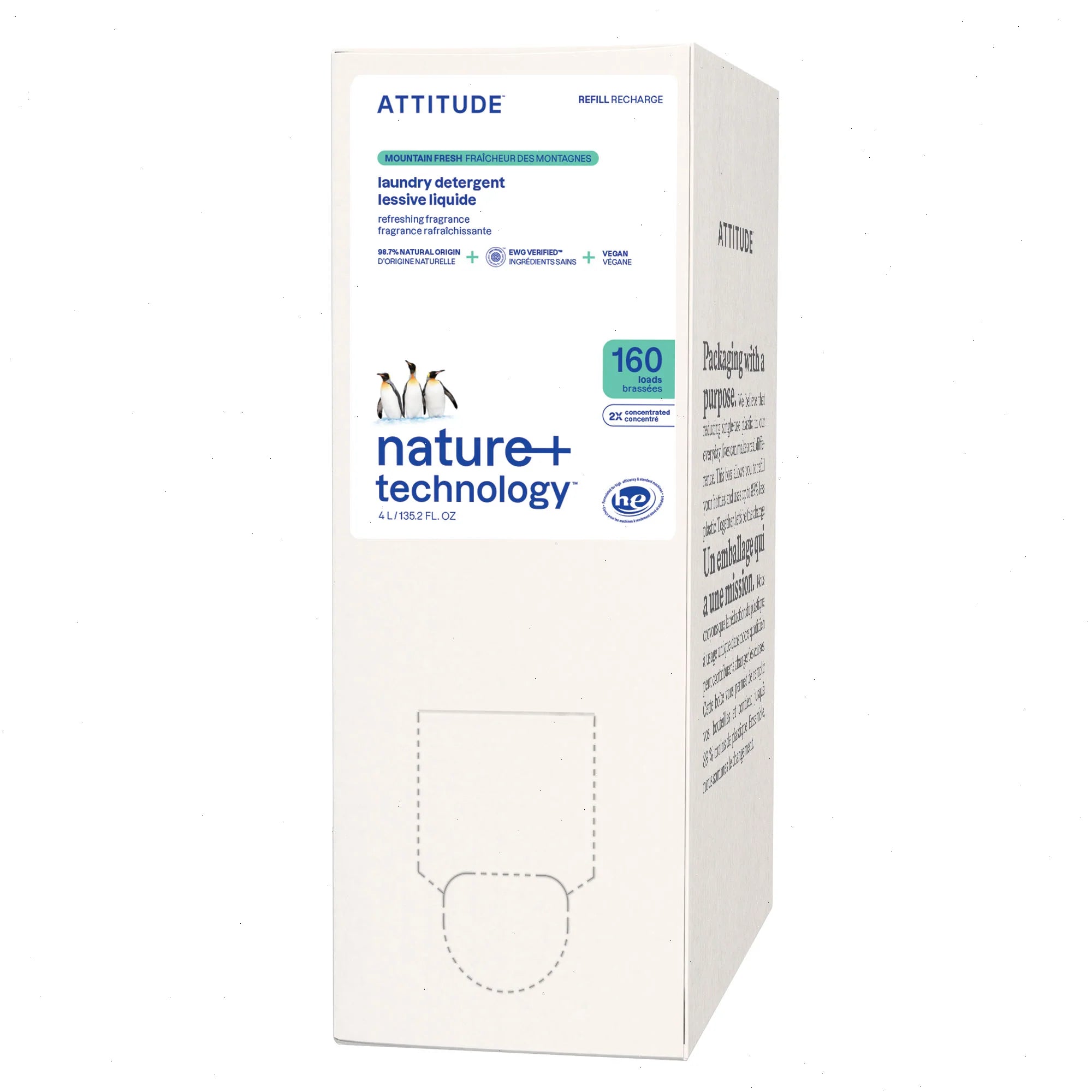 Formulated with 98% naturally derived ingredients, ATTITUDE™ laundry detergent packs excellent detergent power and is free of enzymes. Its aldehyde notes blend perfectly with freesia to create an airy floral blend matched with a mildly sweet combination of almond and vanilla. This blend will envelop your laundry in a fresh and comforting fragrance. Its concentrated formula allows you to do more loads while using the same amount of detergent. Our laundry detergent is effective for cold water wash, saving you energy. Its vegan formula is certified by PETA and is offered in a 4 L eco-refill format that’s easy to use at home.
