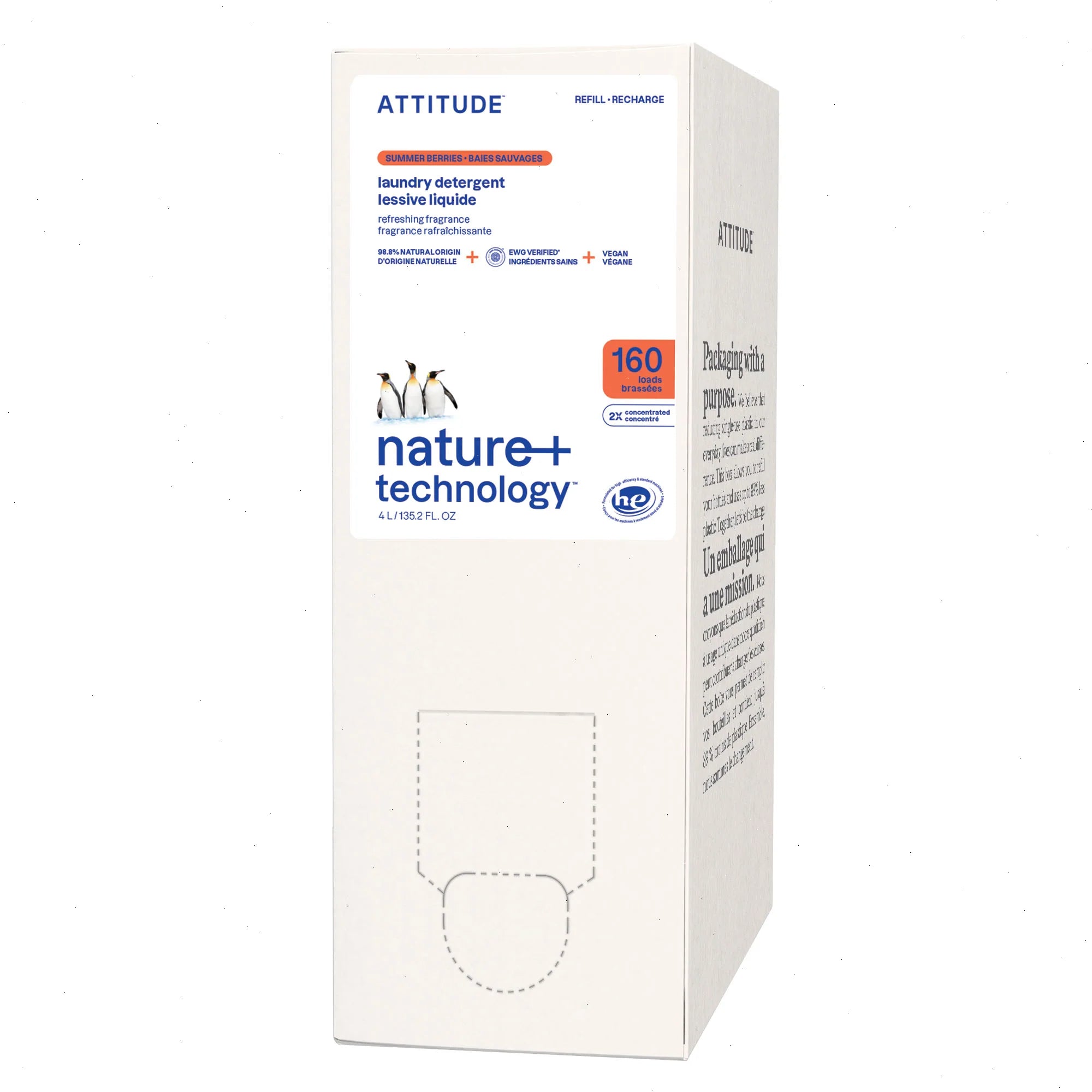 Formulated with 98% naturally derived ingredients, ATTITUDE™ laundry detergent packs excellent detergent power and is free of enzymes. Its juicy berry notes blend harmoniously with floral and powdery violet. This blend will envelop your laundry in a sweet and floral fragrance. Its concentrated formula allows you to do more loads while using the same amount of detergent. Our laundry detergent is effective for cold water wash, saving you energy. Its vegan formula is EWG VERIFIED™, certified by PETA and is offered in a 4L eco-refill format that’s easy to use at home.