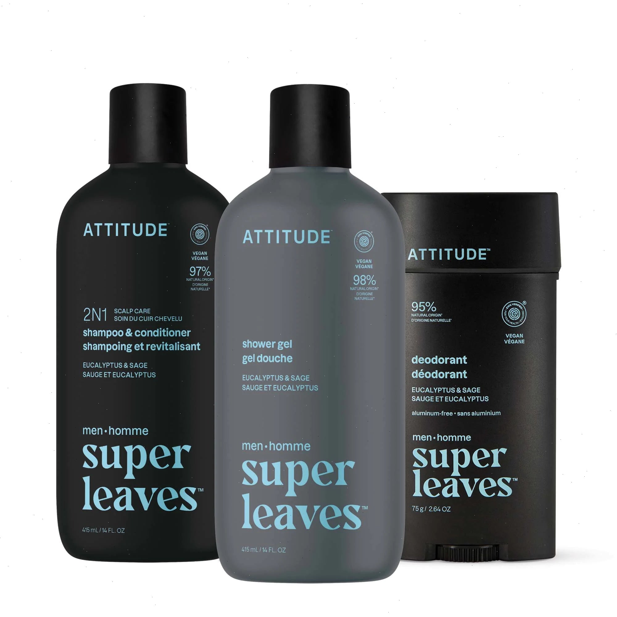 Elevate your daily routine with our complete men's grooming bundle. This bundle includes men's deodorant, men's body wash, and men's shampoo and conditioner, all formulated with over 95% naturally derived ingredients*. Our EWG Verified® vegan formulas deliver high-performance results, while the invigorating scent refreshes your senses and prepares you to tackle the day ahead.